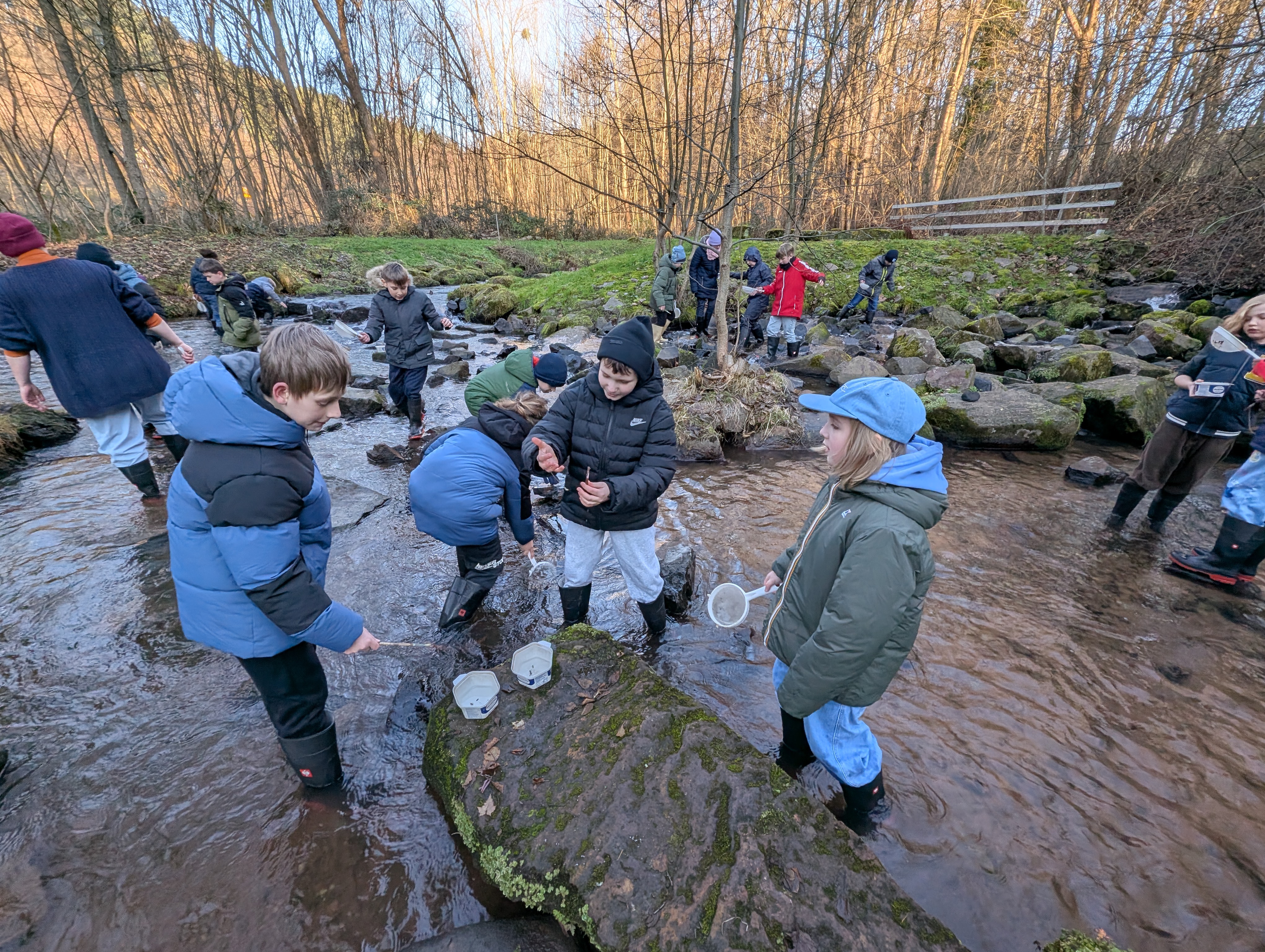In der Woche vor den Weihnachtsferien verbrachte die Klasse 5e vom 15. bis 17. Dezember gemeinsam mit ihrer Klassenlehrerin Frau Schäfer und Herrn Specht erlebnisreiche Kennenlerntage im Schullandheim Hobbach. Als außerschulischer Lernort bot das Schullandheim vielfältige Möglichkeiten, Unterricht praxisnah und anschaulich zu erleben. Beim Projekt „Fließgewässer“ erkundeten die Schülerinnen und Schüler – ausgestattet mit Gummistiefeln, Sieben, Pinseln und Schüsseln – den naturnahen Mittelgebirgsbach Elsava. Dabei sammelten sie verschiedene Wasserlebewesen, die anschließend im hauseigenen Labor bestimmt und dokumentiert wurden.
