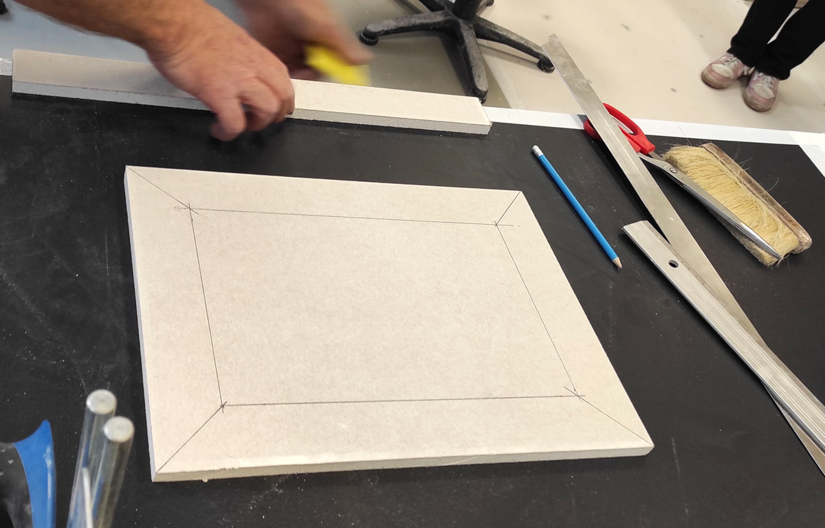 - Vorbereitung: Aufzeichnen der Außenmaße und präzises Zusägen der Leisten auf Gehrung an den Sägevorrichtungen.