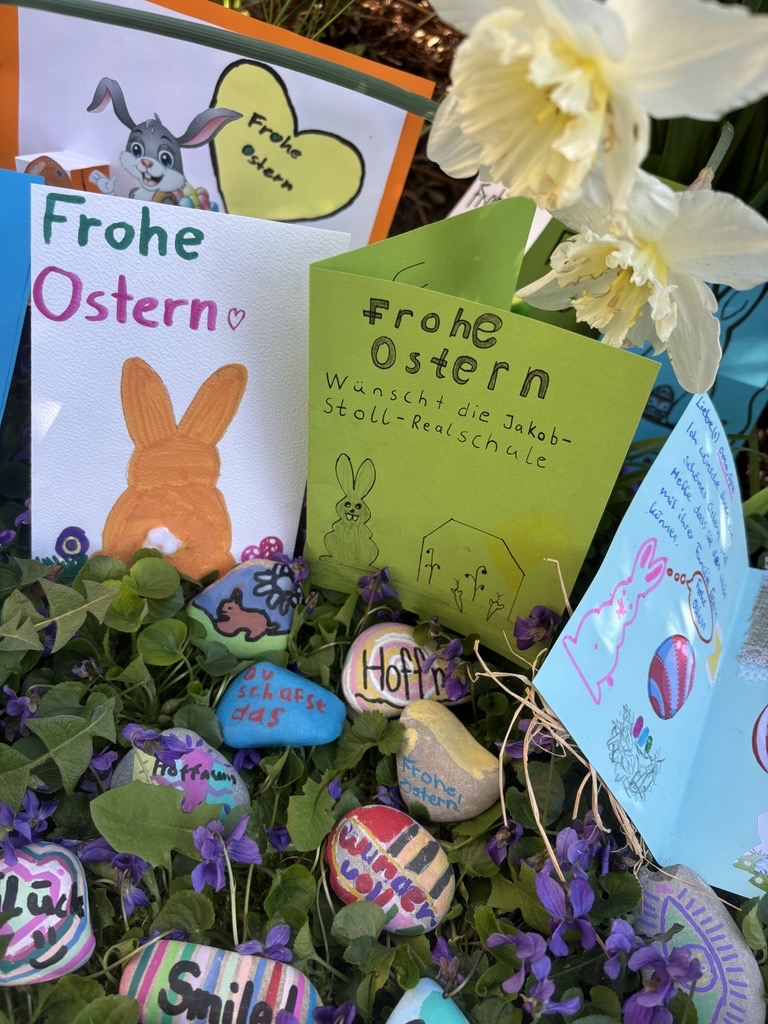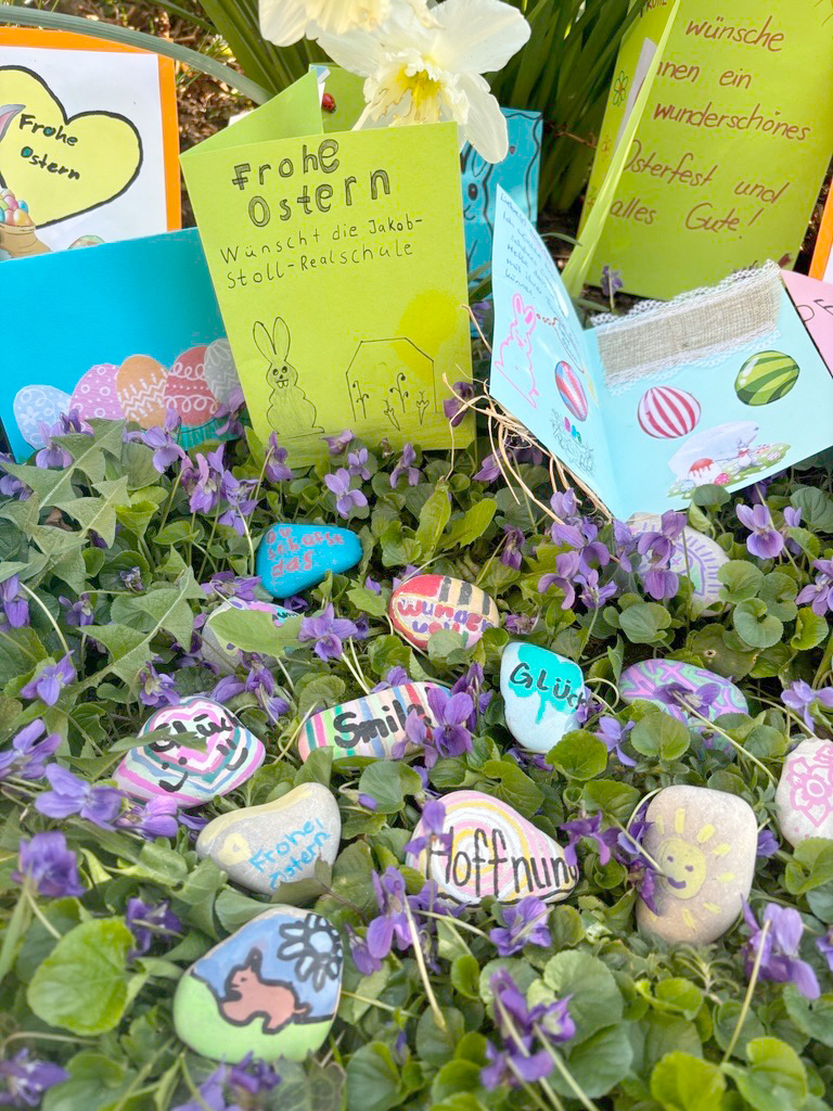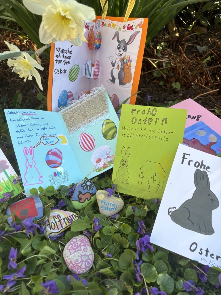 Noch bunter wurden die Ostergrüße durch die vielen selbst gestalteten Karten: Im evangelischen und katholischen Religionsunterricht wie auch im Ethikunterricht hatten Kinder aus allen Klassen farbenfrohe und persönliche Osterwünsche gestaltet, um Freude und Zuversicht zu verschenken.