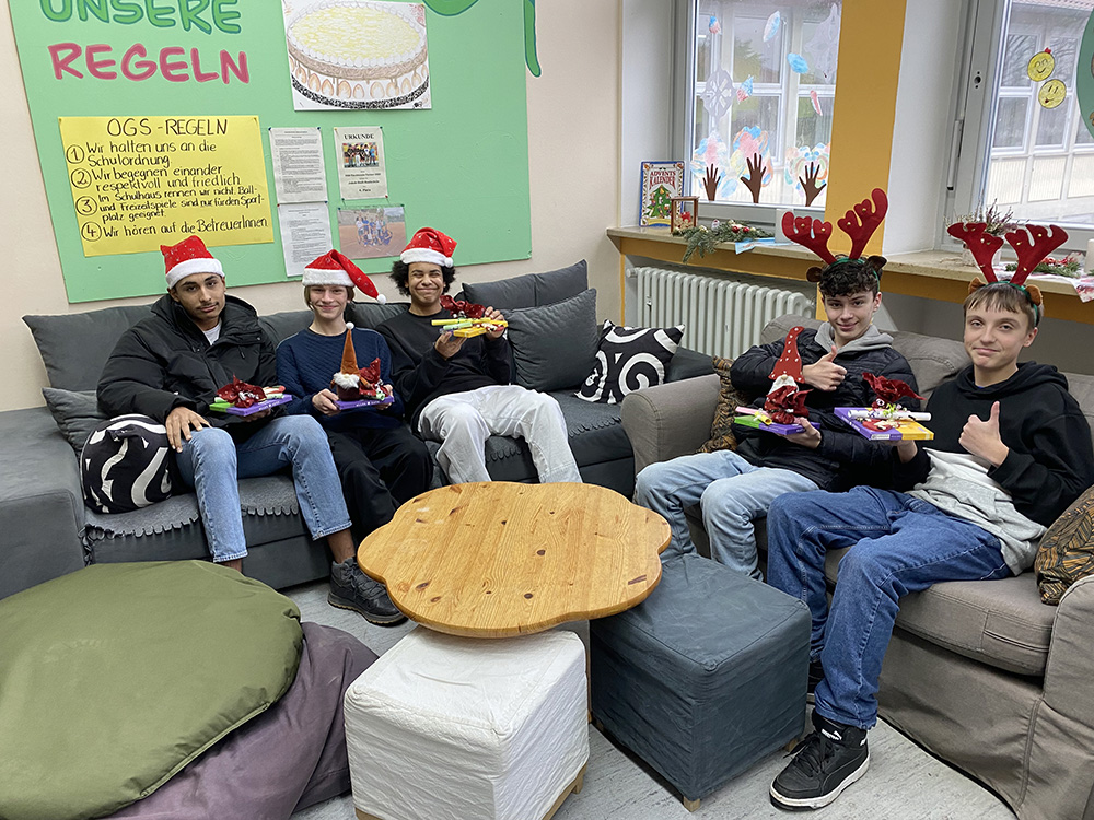 Die Schüler dier OGS machten es sich regelmäßig bei Adventskaffees gemütlich und liesen es sich in der Weihnachtswerkstatt gut gehen. Das Highlight war der Besuch des Nikolaus. Kurz vor Weihnachten gab es bei einer Weihnachtsfeier für jedes Kind ein kleines Geschenk und die Großen haben als „Rentiergespann“ die Geschenke der OGS an die Putzfrauen, Hausmeister und Allen, denen Dank gilt, verteilt.