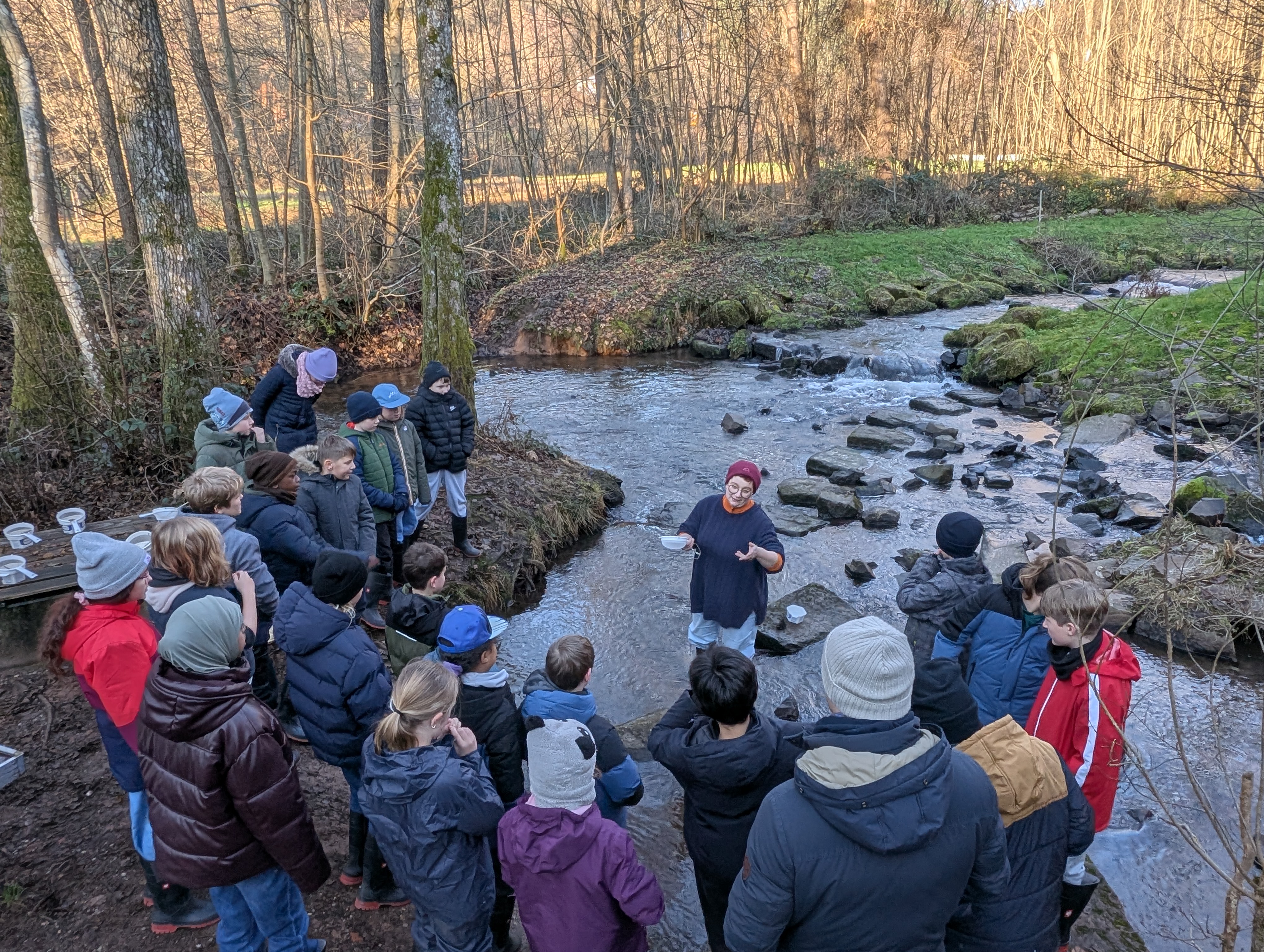 In der Woche vor den Weihnachtsferien verbrachte die Klasse 5e vom 15. bis 17. Dezember gemeinsam mit ihrer Klassenlehrerin Frau Schäfer und Herrn Specht erlebnisreiche Kennenlerntage im Schullandheim Hobbach. Als außerschulischer Lernort bot das Schullandheim vielfältige Möglichkeiten, Unterricht praxisnah und anschaulich zu erleben. Beim Projekt „Fließgewässer“ erkundeten die Schülerinnen und Schüler – ausgestattet mit Gummistiefeln, Sieben, Pinseln und Schüsseln – den naturnahen Mittelgebirgsbach Elsava. Dabei sammelten sie verschiedene Wasserlebewesen, die anschließend im hauseigenen Labor bestimmt und dokumentiert wurden.