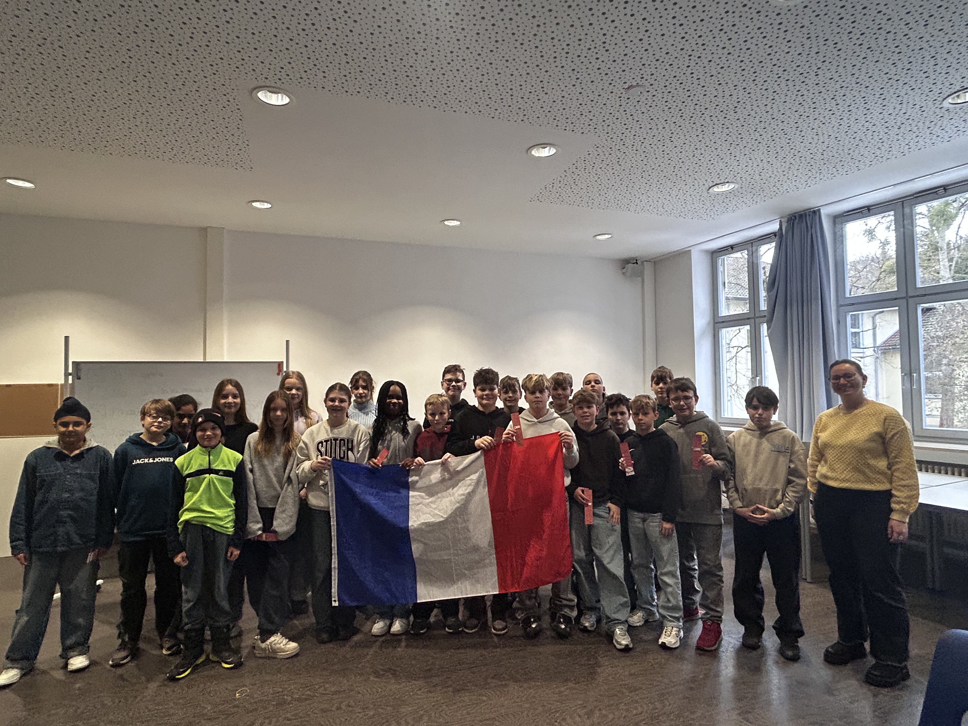 Am 2. Februar 2026 durften unsere Schülerinnen und Schüler der Jahrgangsstufe 6 einen abwechslungsreichen Einblick in die französische Sprache erleben. Die europäische Freiwillige Callyssandre Derrettebesuchte im Rahmen des Programms „Salut tout le monde“ alle sechsten Klassen und vermittelte in jeweils einer Schulstunde auf spielerische Weise erste Wörter und einfache Phrasen.