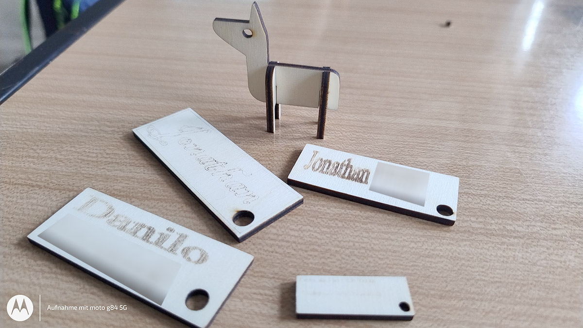 Ansonsten toben wir uns im Maker Space aus, in dem wir z. B. am PC gezeichnete Figuren und Schlüsselanhänger vom Laser-Cutter ausschneiden lassen.