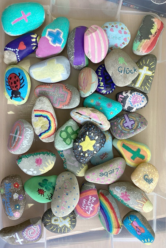 In den Wochen zuvor war das Klassenzimmer in eine kleine Werkstatt verwandelt worden. Mit Acrylfarbe und Fantasie bemalten die Jugendlichen glatte Kieselsteine – als Zeichen der Hoffnung und als Symbol dafür, dass Gott uns die Last von den Schultern nehmen kann. Gemeinsam wollten die Schülerinnen und Schüler die Steine in der Kapelle des Seniorenheims zu einem Kreuz vor den Altar legen – als stilles, aber kraftvolles Zeichen für Verbundenheit und Segen.